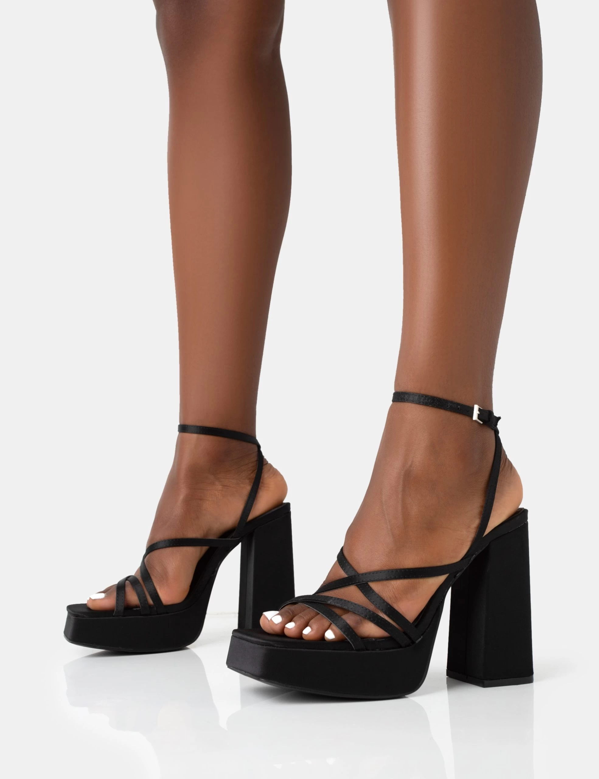 No basic diva will be able to resist these Fate Black Satin Strappy Heels! They’re the perfect mix of retro and glamour, and a guaranteed way to get you grooving on the dance floor – Abba would definitely be jealous! The platform block heel and wrap-around ankle straps are sure to keep you looking and feeling fabulous. Yowsa!