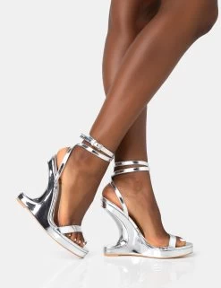 A-list Silver Mirror Barley There Wrap Around Platform Cut Out Wedge Heels