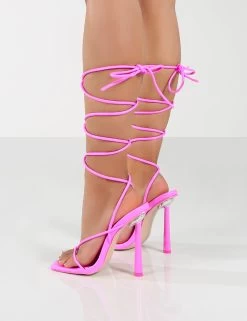 Lacey Bubblegum Pink Square Toe Strappy Lace Up Stiletto Heels