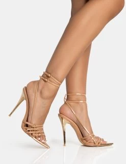 Majesty Nude Patent Buckles Wrap Around Pointed Toe Gold Stiletto Heel