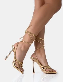 Glow Up Gold PU Knotted Strappy Lace Up Square Toe Stiletto Heels